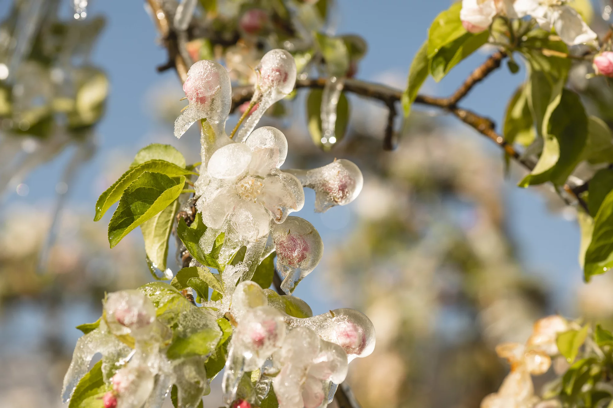 Im Frühjahr entscheidet sich im Apfelland Südtirol oft innerhalb weniger Stunden über den späteren Ertrag. Spätfröste während der sensiblen Blütephase können bereits bei Temperaturen knapp unter 0 °C erhebliche Schäden verursachen. Deshalb ist die Frostschutzberegnung ein zentrales Element im modernen Apfelanbau in Südtirol. Dabei werden die Obstanlagen in Frostnächten kontinuierlich mit feinem Wasser besprüht. Gefriert das Wasser an der Blüte, entsteht eine schützende Eisschicht. Durch die dabei freigesetzte Kristallisationswärme bleibt die Temperatur an der Blüte konstant bei etwa 0 °C – empfindliche Pflanzenstrukturen werden so vor dem Erfrieren bewahrt. Diese präzise gesteuerte Maßnahme erfordert moderne Technik, genaue Wetterbeobachtung und ein gut ausgebautes Bewässerungsnetz. Die Frostschutzberegnung ist damit eine entscheidende Investition in Ertragssicherheit, Qualität und wirtschaftliche Stabilität der Südtiroler Apfelbetriebe. Zusätzlich ist die Frostschutzberegnung auch ein faszinierendes Naturschauspiel. Wenn sich in frostigen Frühlingsnächten eine gläserne Eisschicht über Blüten, Zweige und ganze Obstgärten legt, entstehen eindrucksvolle Eisformationen, die die Anlagen in funkelnde Landschaften verwandeln. Besonders in Südtirol zieht dieses seltene Zusammenspiel aus Natur und landwirtschaftlicher Technik zahlreiche Fotografen und Naturliebhaber an und gilt als einzigartiges visuelles Highlight der Apfelblütezeit.